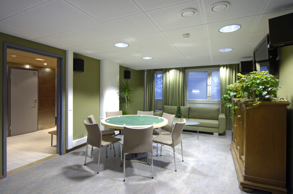 Saunatupa Sisu on varustettu äly-televisiolla, bluetooth-kaiuttimella ja blue-ray -soittimella. Lisäksi tilasta löytyy jääkaappi, mikro, kahvin- ja vedenkeittimet sekä kertakäyttöastioita. Tilan pyöreä pöytä toimii käännettäessä pokeripöytänä.